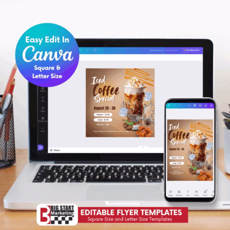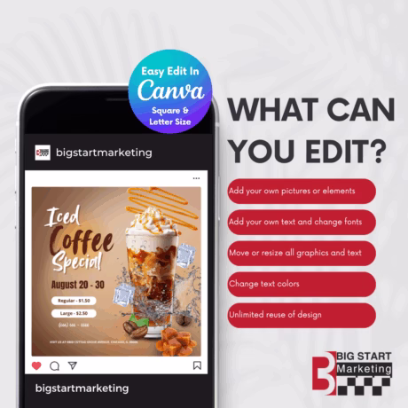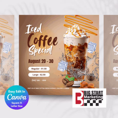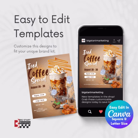 This professionally designed Iced Coffee Special Editable Canva Template is perfect for small business who need to save time and get back to growing their business. With its affordable price and easy editing- no software needed, it makes small business owners and entrepreneurs’ journey a lot easier.