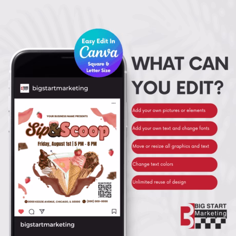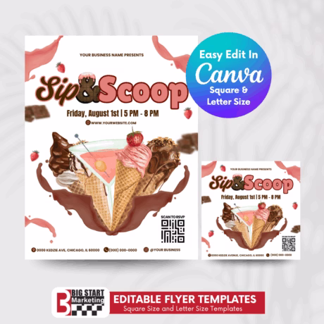 This professionally designed Sip and Scoop Ice Cream Editable Canva Flyer Template is perfect for small business who need to save time and get back to growing their business. With its affordable price and easy editing- no software needed, it makes small business owners and entrepreneurs’ journey a lot easier.